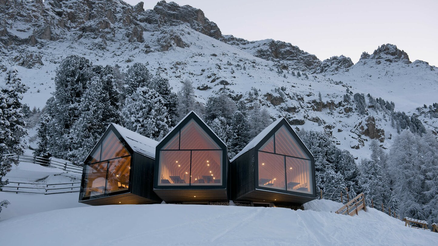 The Absam Stube blends traditional Alpine elements with modern design: black-stained wood, bold checkered patterns, playful touches like snowboard swings, and a vibrant atmosphere. Its panoramic terrace offers stunning views of the Latemar Dolomites, perfect for a relaxing break.